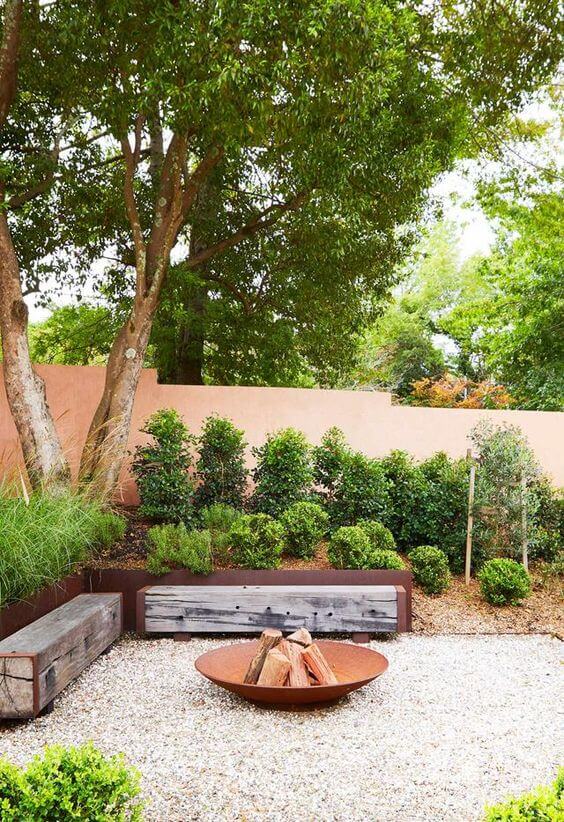 #23 DIY Fire Pit And Simple Long Wood Bench In The Lush And Green Garden