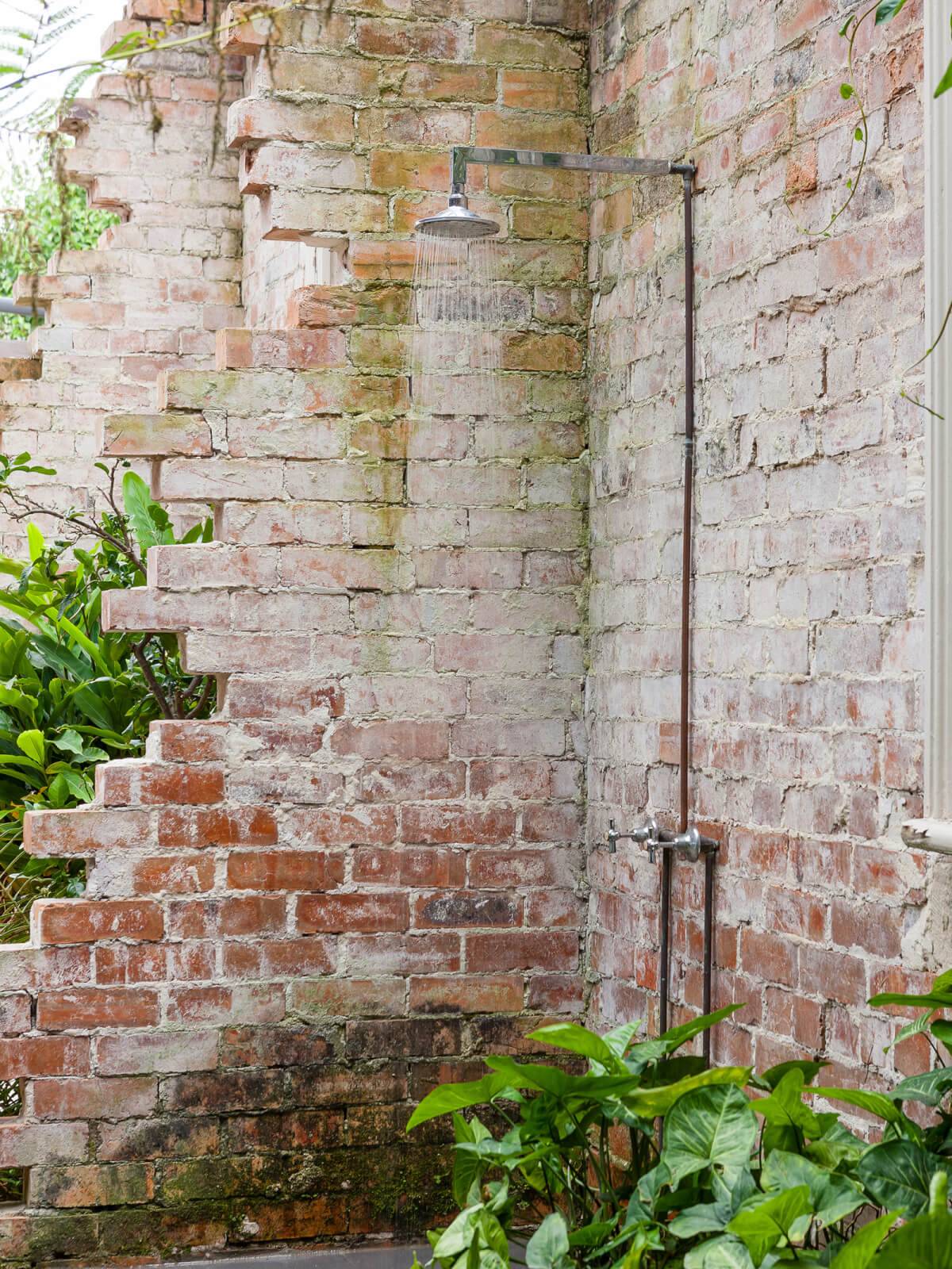 Create a refreshing outdoor shower with brick walls, allowing you to connect with nature while enjoying the convenience of modern amenities.