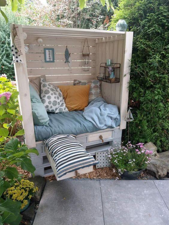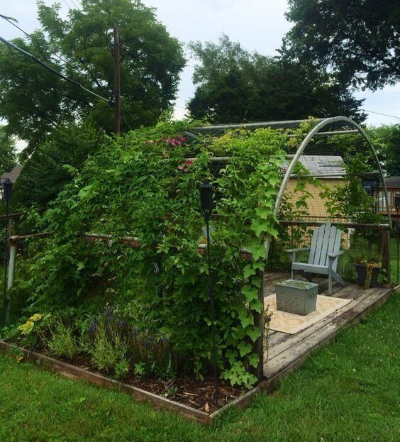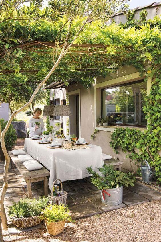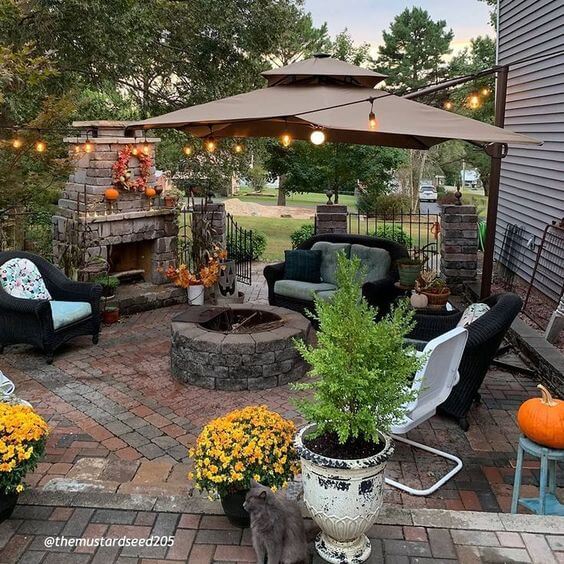 There are many creative ways to build a shade structure using low-cost materials such as wood, DIY-friendly fabric tent, branches, and even twigs! Or you can use a big outdoor umbrella, it is one of the most simple patio shade covers you can buy easily.