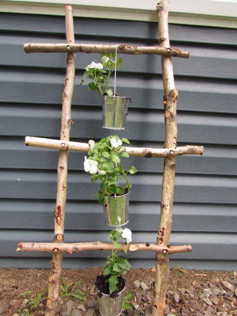 Step 2: Prop the trellis against a wall or anchor it in the soil. Hang lightweight planters from each rung using hooks or twine.